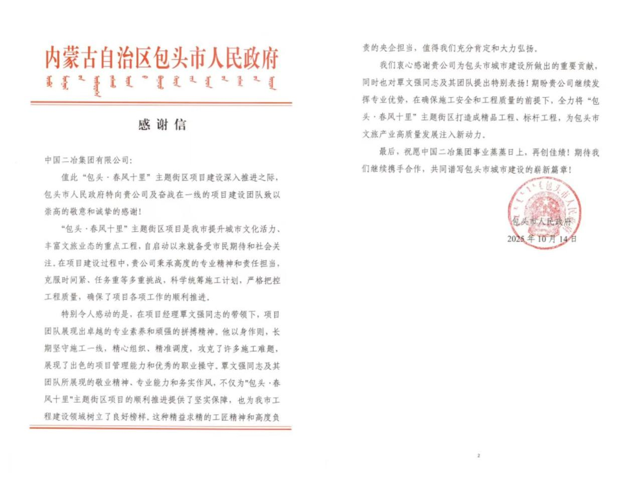 這封感謝信不僅是對中國二冶項(xiàng)目團(tuán)隊(duì)攻堅(jiān)克難、高效履約的高度認(rèn)可,更是對中國二冶秉持工匠精神、踐行央企責(zé)任擔(dān)當(dāng)?shù)挠辛τ∽C。中國二冶將以此為激勵,持續(xù)發(fā)揮專業(yè)優(yōu)勢,在嚴(yán)守施工安全與工程質(zhì)量的前提下,全力將“包頭?春風(fēng)十里”主題街區(qū)打造成精品工程、標(biāo)桿工程,為包頭市文旅產(chǎn)業(yè)高質(zhì)量發(fā)展注入更多二冶力量。